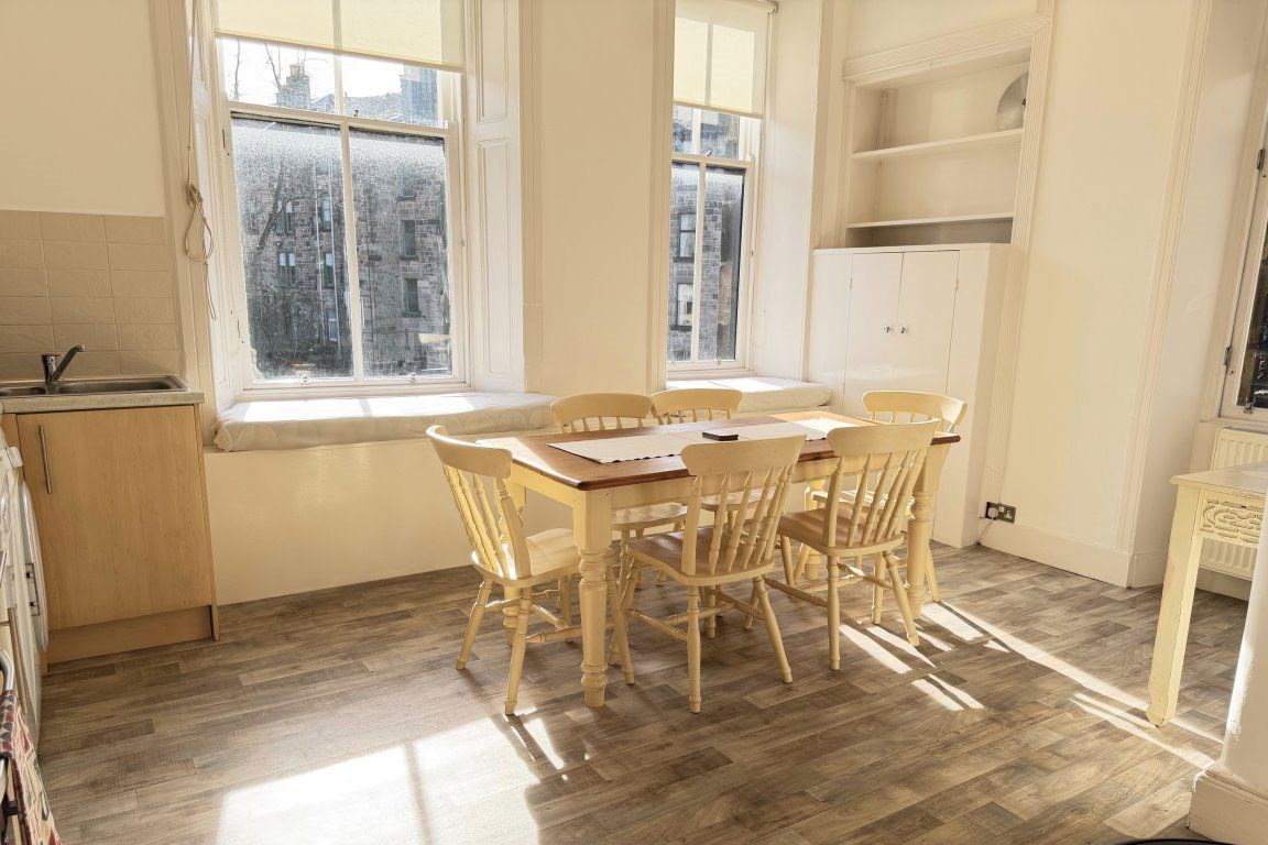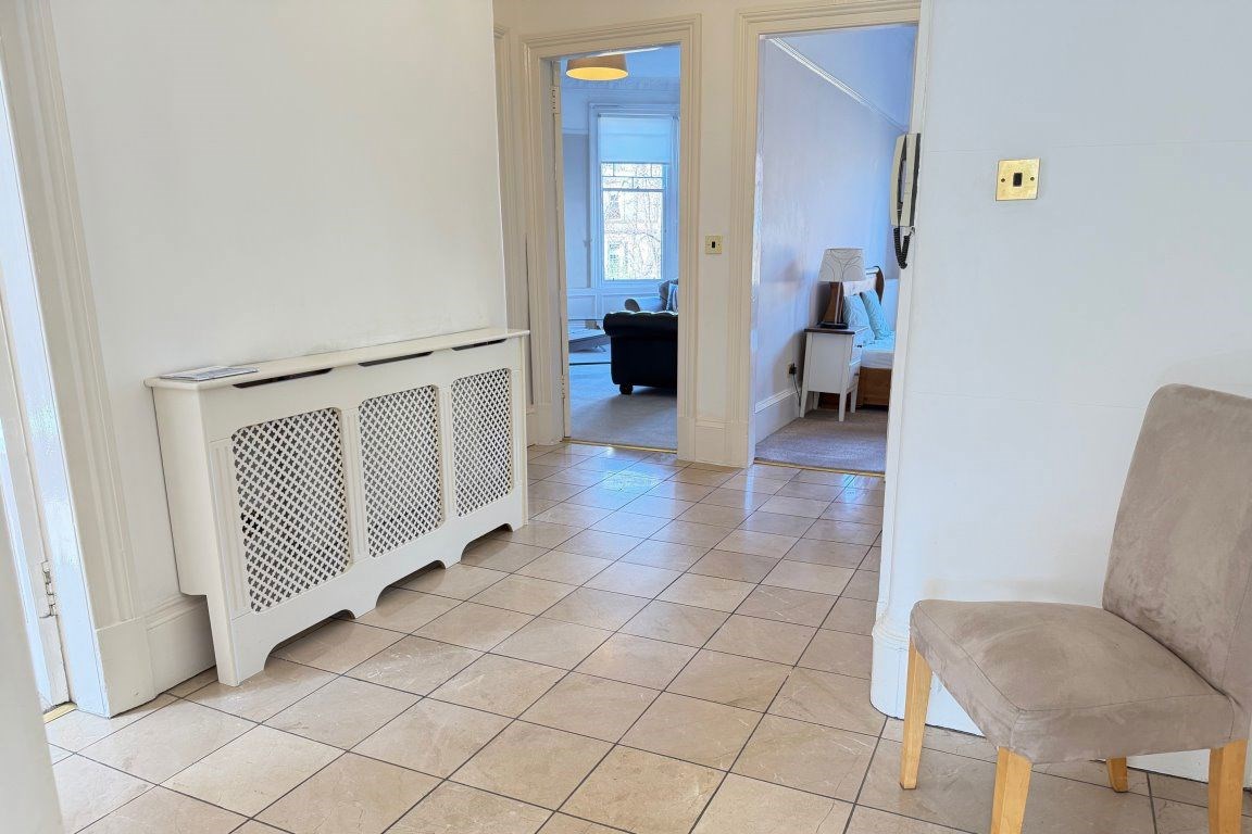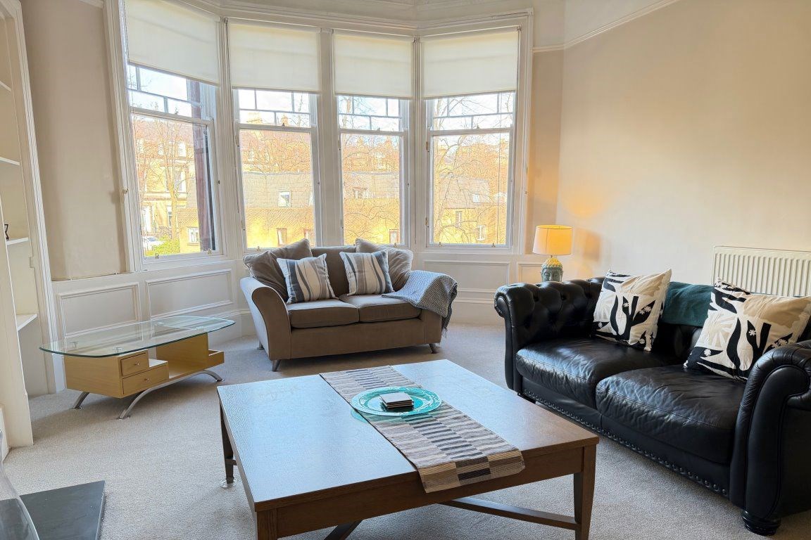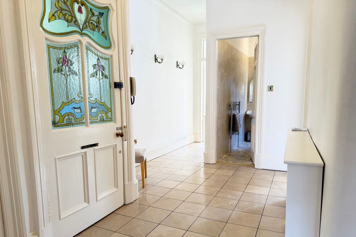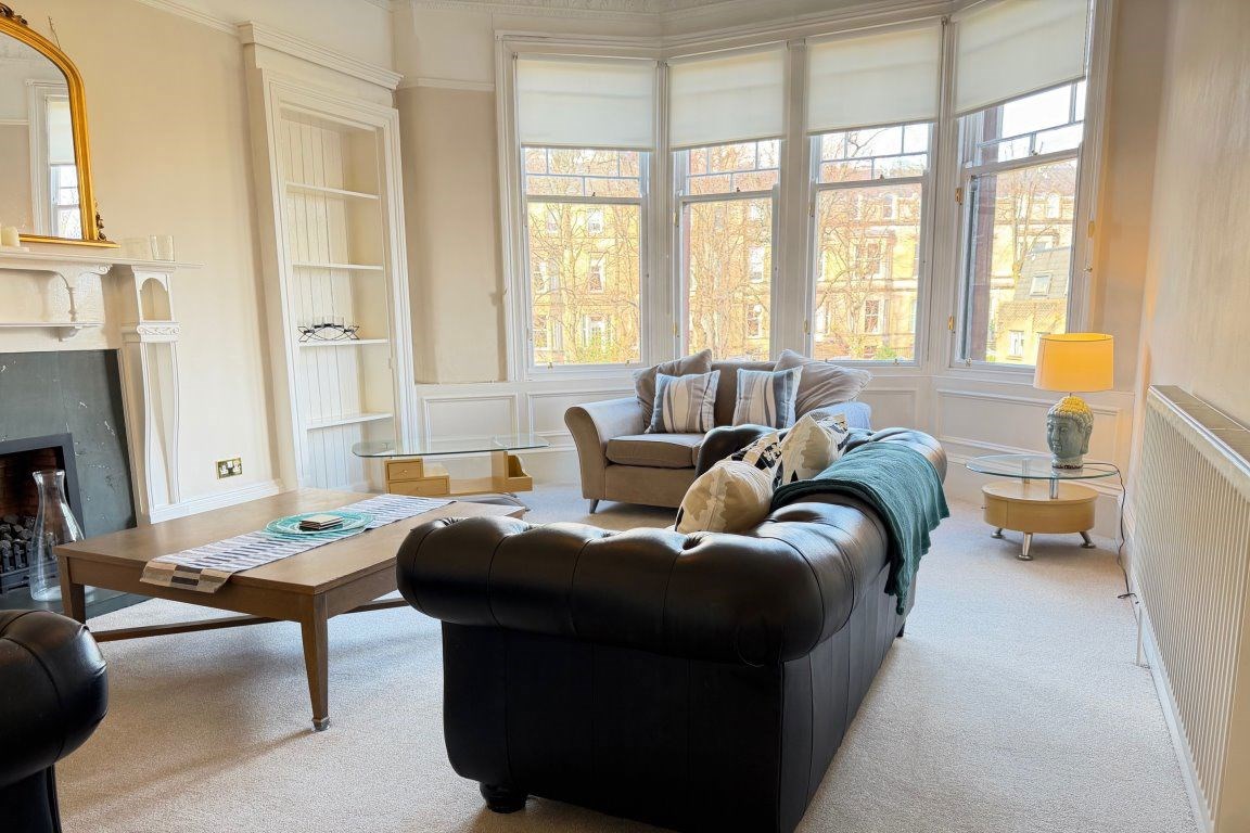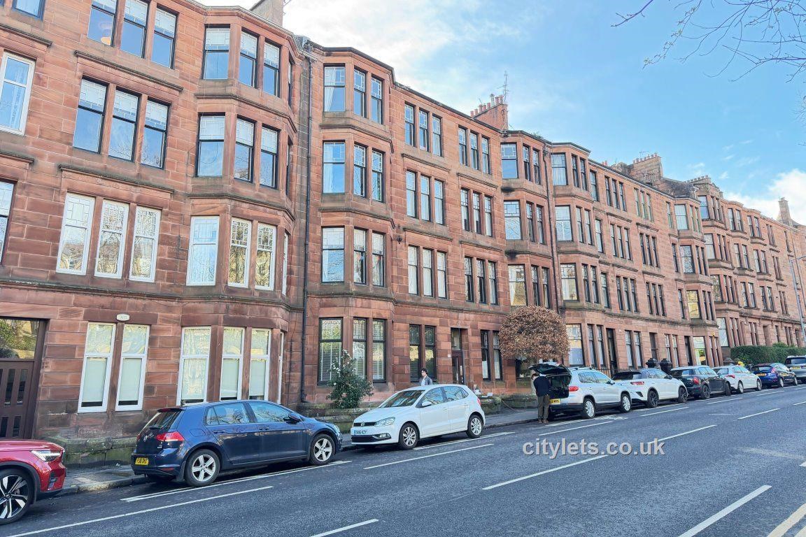 Situated within a beautiful red sandstone tenement block, with an attractive outlook onto mature trees and the surrounding West End skyline, this spacious top floor apartment is flooded with natural light. The accommodation extends to: - large reception hallway, with beautiful tiled floor and two large store cupboards. The hallway also affords ample space for a study area. There is a bay windowed lounge, a nicely proportioned dining sized integrated kitchen, two well-proportioned double sized bedrooms (one with large recessed walk-in wardrobe) and an attractive bathroom, featuring a white three-piece suite, with over bath shower, and tiling to three quarter height. The property has gas central heating and a door security entry system is in operation. The property retains many original features, including ceiling cornicing and ornate stained glass.