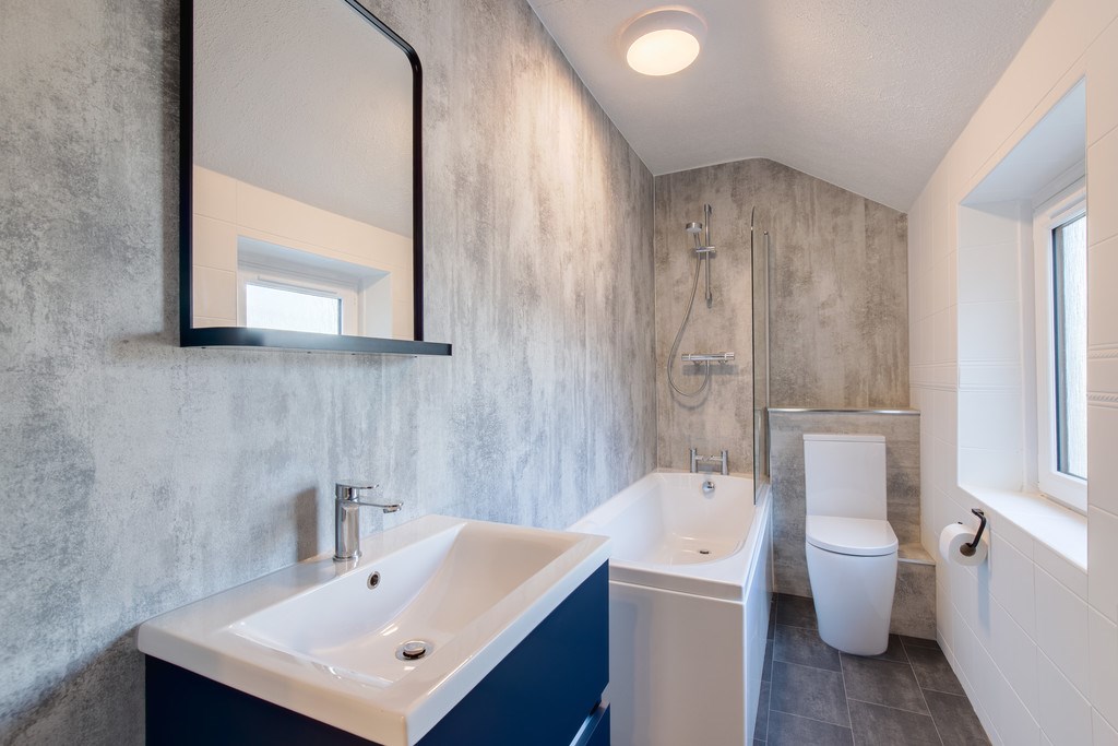 UPSTAIRS BATHROOM The upstairs bathroom for this property is located straight ahead along the landing as you reach the top of the stairs. This bathroom has a sleek, contemporary design with a wonderfully light and airy feel. The walk-in shower with its glass enclosure enhances the sense of openness, while the streamlined fixtures add a polished, high-quality finish. The compact yet well-planned layout makes excellent use of the space, combining practicality with style.