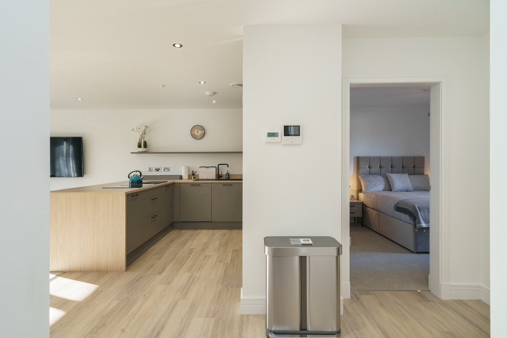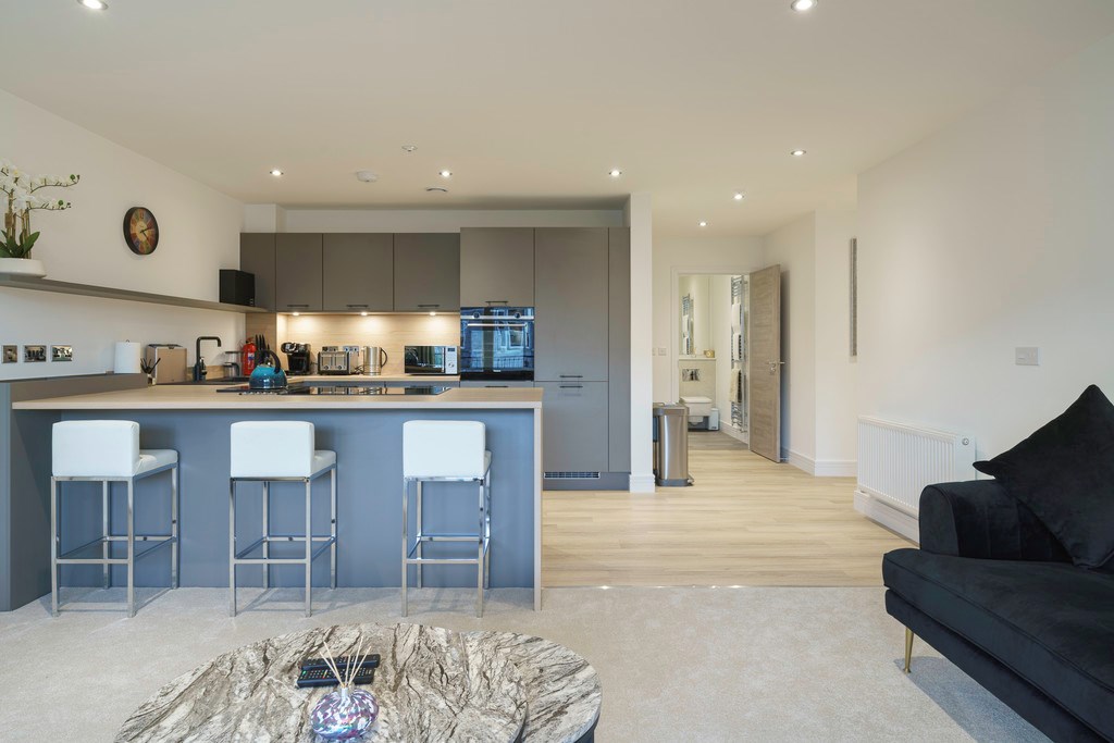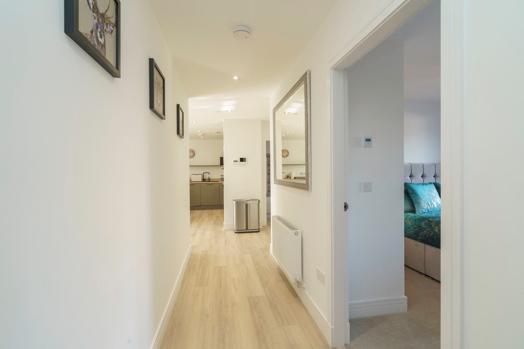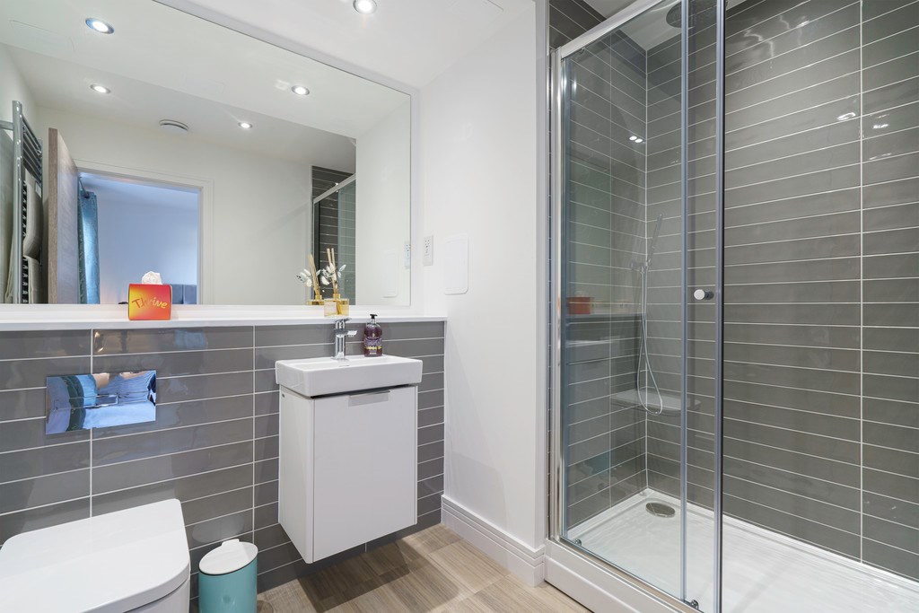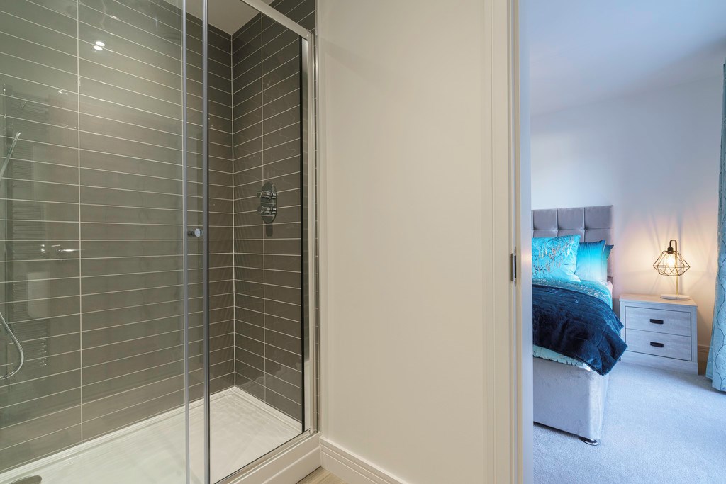 BEDROOM 2 (MASTER) A fantastic master bedroom with extremely large windows overlooking the rear of the development, providing an excellent amount of natural light. This room has been decorated in neutral tones and luxury beige carpeted flooring. The fully fitted wardrobes provide an excellent range of storage facilities and benefits from a modern large en-suite featuring a floating vanity unit with sink, wall hung toilet and a large walk-in shower enclosure. The ensuit benefits from a large, mirrored wall and shaving points.