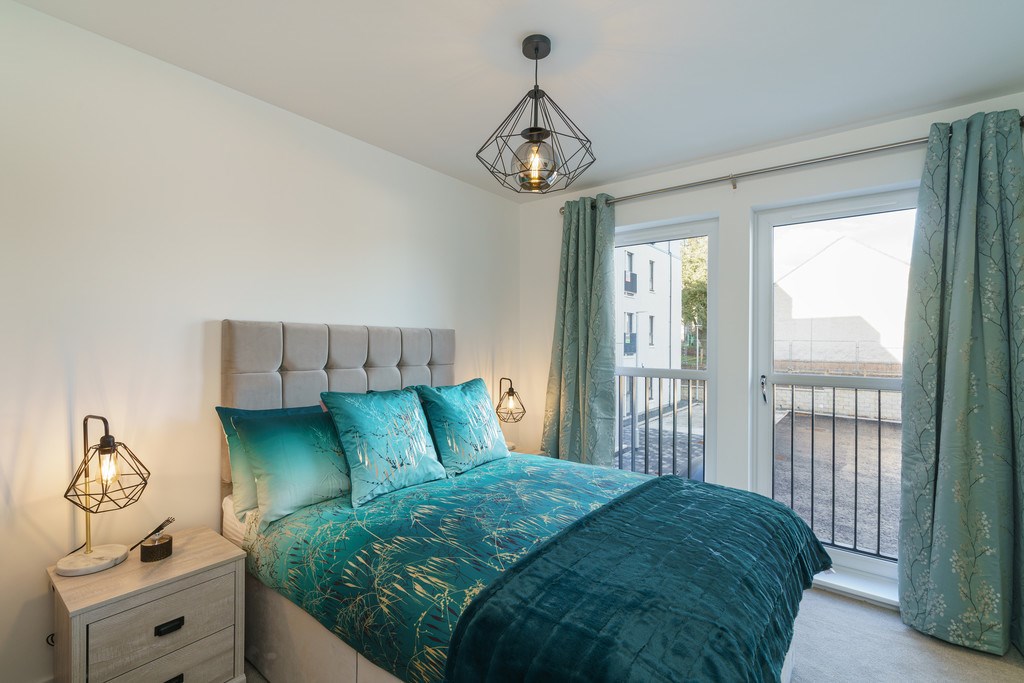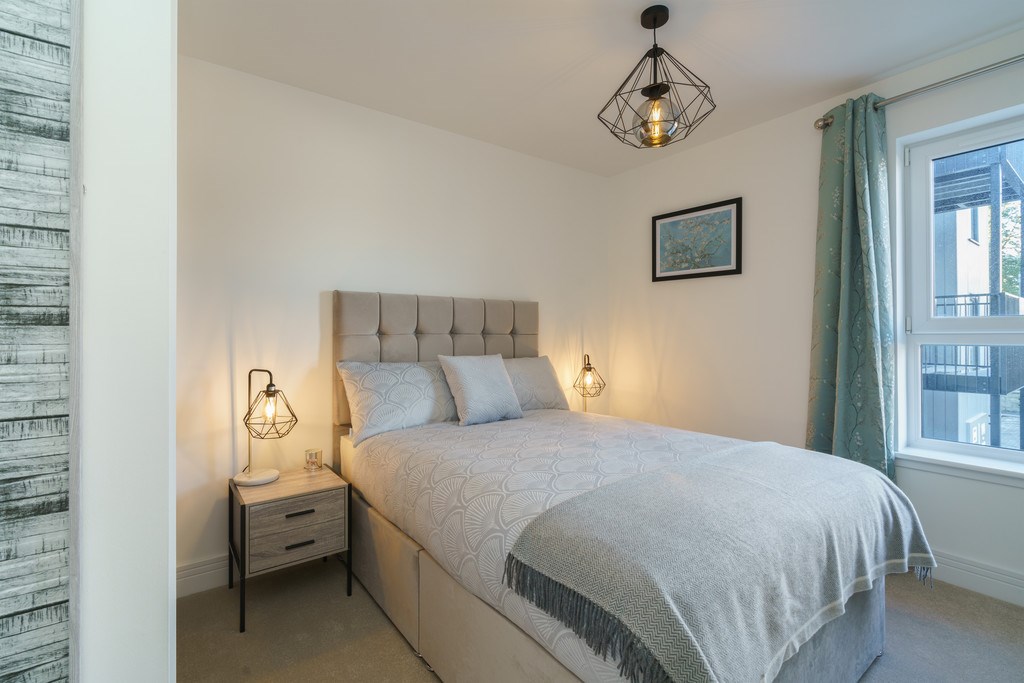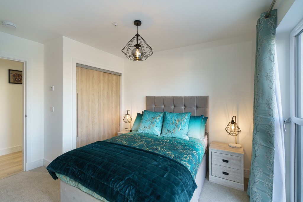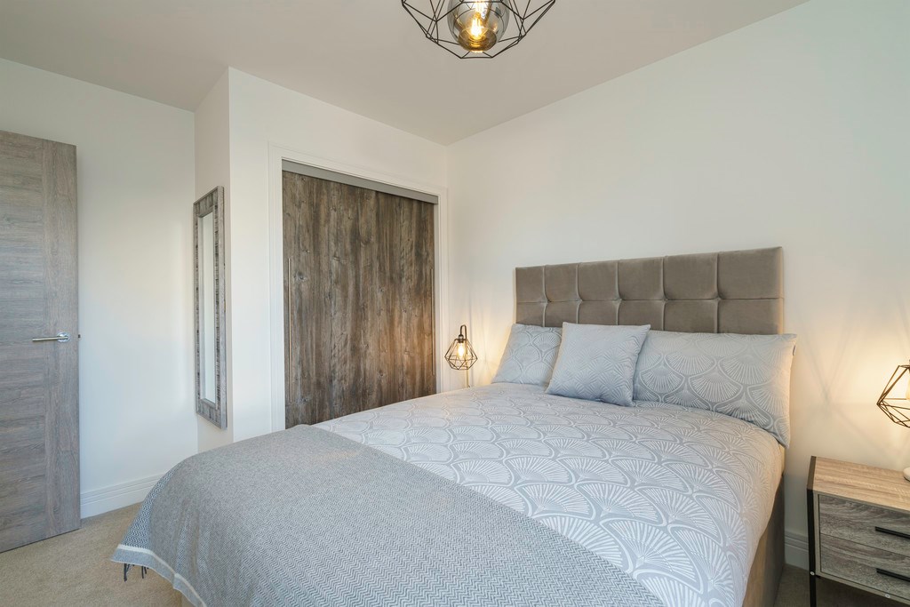 BEDROOM 1 Beautiful double bedroom with a large built-in Alpine grey woodgrain pre-finished internal pass doors, providing an abundance of storage. This room is decorated in a neutral toes and plush beige carpeted flooring. The bedroom is furnished with a quality double bed with mattress, two matching bedside tables and a beautiful large wall hung mirror. Plenty of natural light is provided by the large double-glazed windows.