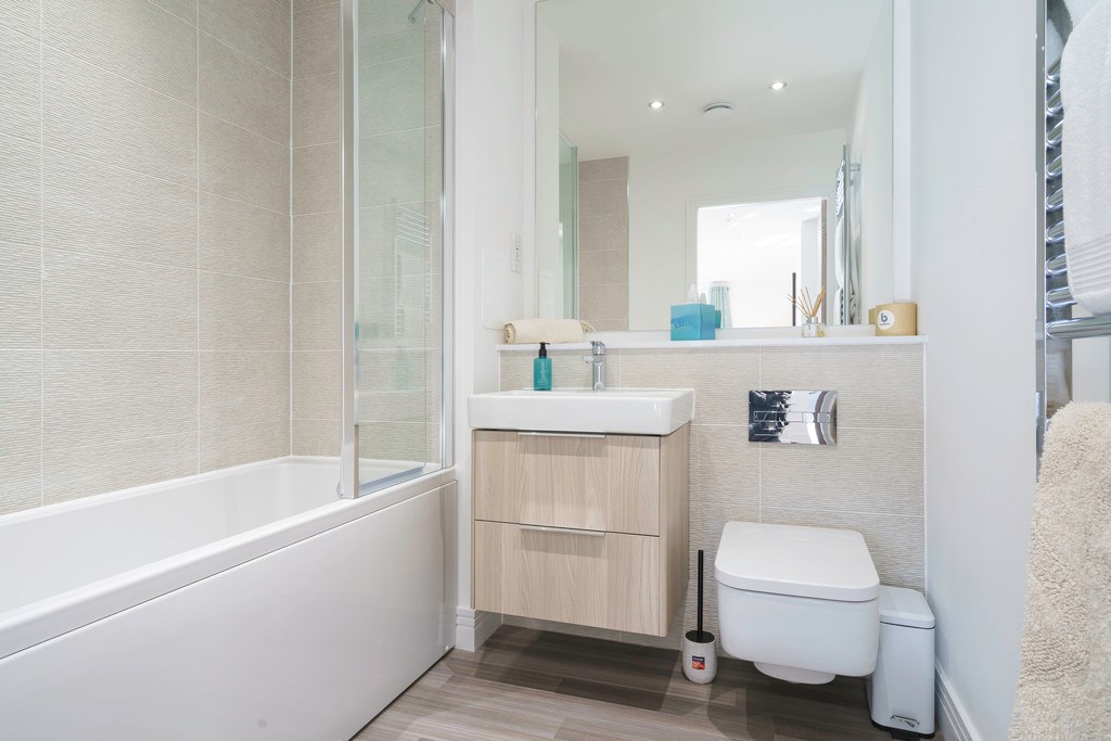 BATHROOM Modern bathroom which has had no expense spared. The family bathroom is complete with a gas mains shower over bath, wall hung vanity unit with sink and a wall toilet. This room benefits from laminated flooring, heated towel rail and a large mirror.
