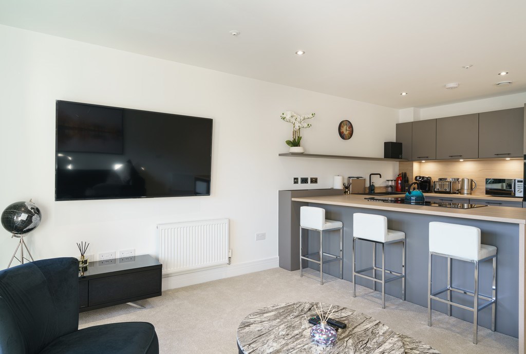 LIVING ROOM Extremely spacious and imposing living space. The lounge area is decorated to an extremely high standard with neutral tones. Boasting from three ceiling to floor windows. Solid hardwood floors along with plush beige carpeted flooring and high-quality furnishings complete this room. Large patio doors lead on to a beautiful private balcony enjoying views of the West-End. The living area is furnished with a large luxury L shaped black suede sofa, single armchair, Marbled coffee table, wall hung flat screen tv and a black gloss TV unit.