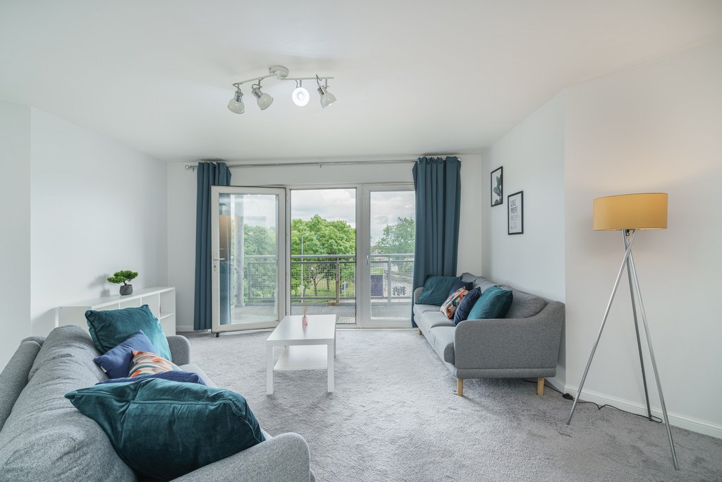 LOUNGE/ KITCHEN The kitchen is modern in design with sleek white high gloss finish and a wooden countertop with white tiled backing. The kitchen is fully equipped with a gas hob, integrated oven, integrated dishwasher, and a full-size integrated Fridge/freezer. Between the kitchen and living area there is a white dining table which can accommodate up to four people making this space ideal for entertaining. The living area is very spacious and is furnished to a high standard with two, two-seater fabric sofa's, white coffee table, white storage unit and soft furnishings. Double patio doors lead out to an enclosed large balcony enjoying spectacular views of the City Centre. An abundance of natural light streams through the property.