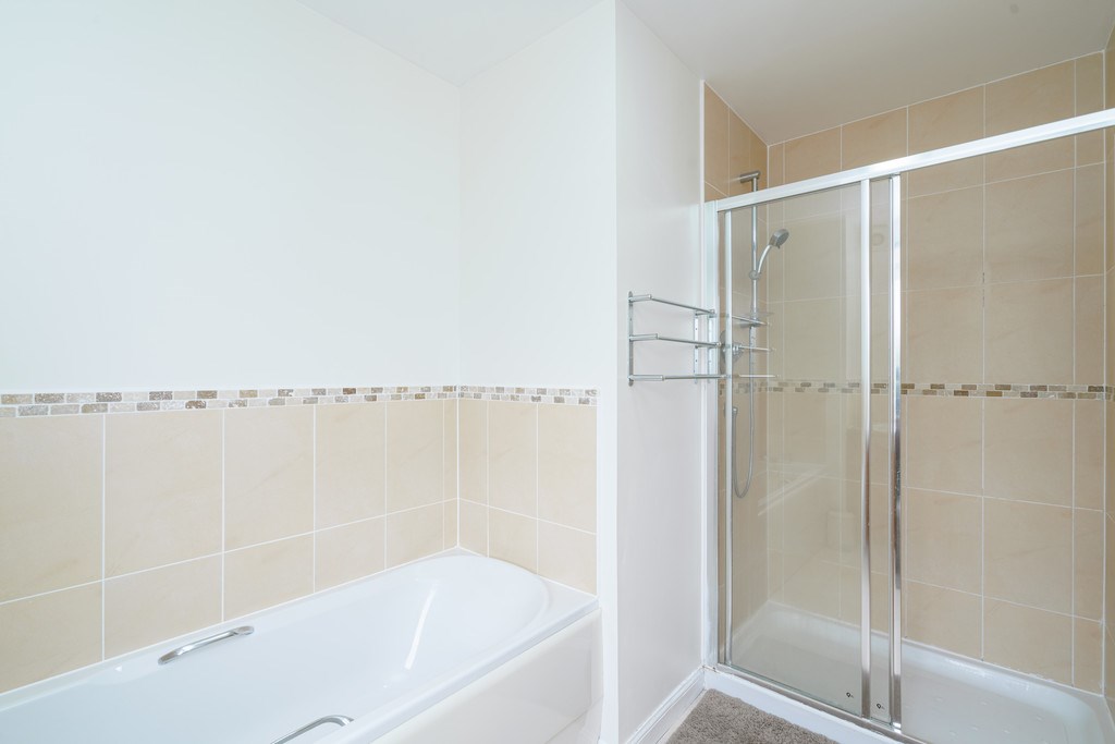 MASTER BEDROOM This bedroom is very spacious and is decorated in neutral colours with grey plush carpeted flooring. Similarly, to the living area this room is flooded with light from the large window. It also benefits from built in mirrored storage provide a great amount of storage facilities. The en-suite is contemporary and boasts a large walk-in shower, separate full-size bathtub and a vanity unit with sink and toilet. Further storage is provided with hanging rails and vanity unit storage cupboards.