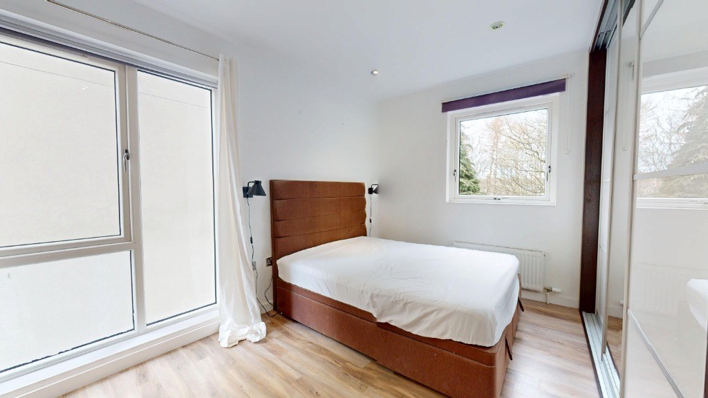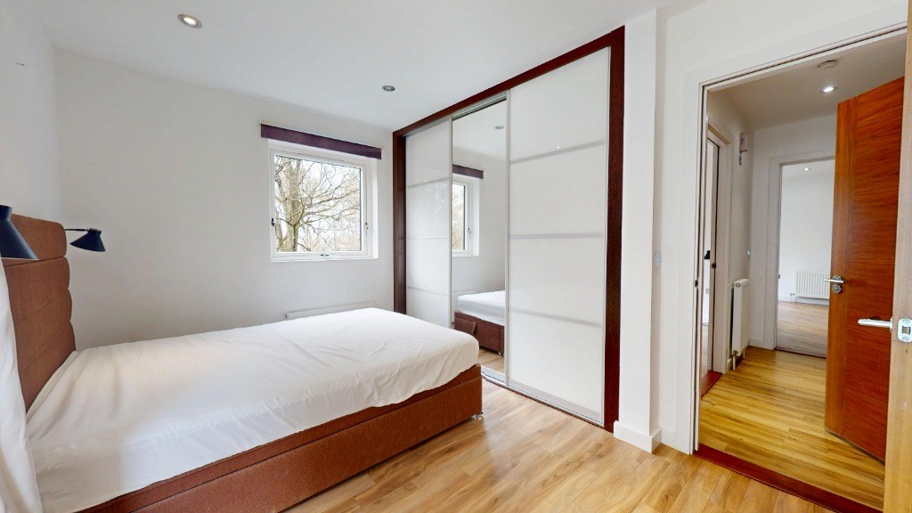 Master Bedroom Walnut veneer door, light wooden flooring, neutral painted walls and white skirting, white mains radiator. White ceiling with 4 spotlights, large window with roller blind facing street (North facing). Full length windows with curtain rail facing side of house (West facing). Built-in sliding wardrobe with mirrored and frosted doors; 0.6m x 1.6m. Walnut veneer door to en-suite.