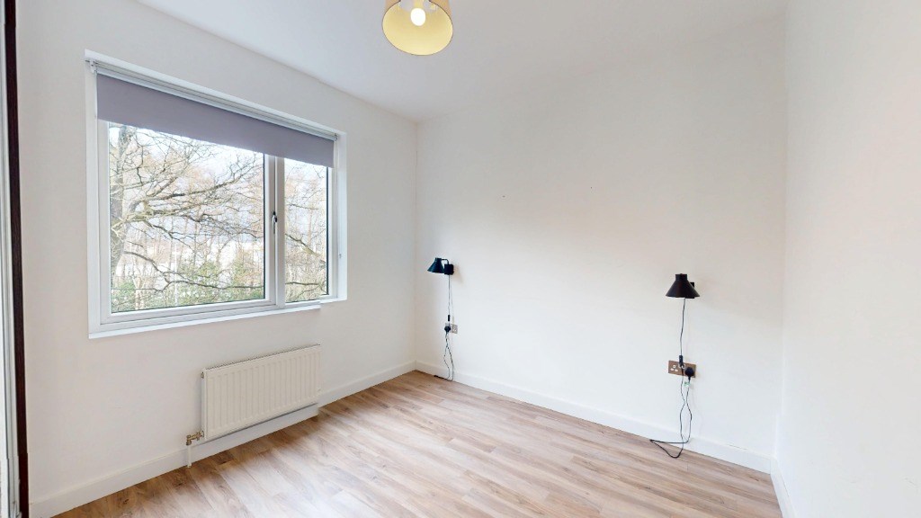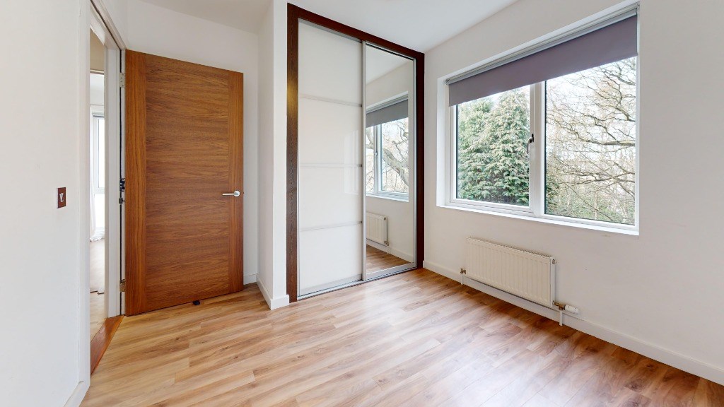 Bedroom Two Walnut veneer door, light wood flooring, neutral painted walls with white skirting. White painted ceiling with pendant light fitting, white mains radiator. Single window facing street (North facing). Built-in sliding wardrobe with mirror and frosted doors.