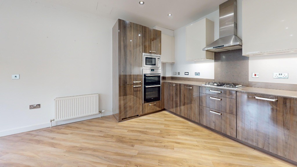 Lounge/Kitchen Walnut veneer door with glass panels, light wood flooring, neutral painted walls with white skirting. White painted ceiling with 12 dimmer spotlights. Glass double doors to balcony area, large floor length windows facing street (North facing). Two white mains radiators. Walnut gloss and white kitchen units, gas hob and silver extractor. Integrated fridge freezer, dishwasher, microwave and oven.