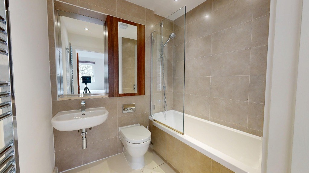 En-Suite Bathroom Walnut veneer door, white tiled flooring, neutral painted walls with beige tiling. White ceiling with 4 spotlights and extractor fan, silver wall-mounted towel radiator, 2x mirrors. White W/C and white sink, mains powered shower over bath with glass shower door.