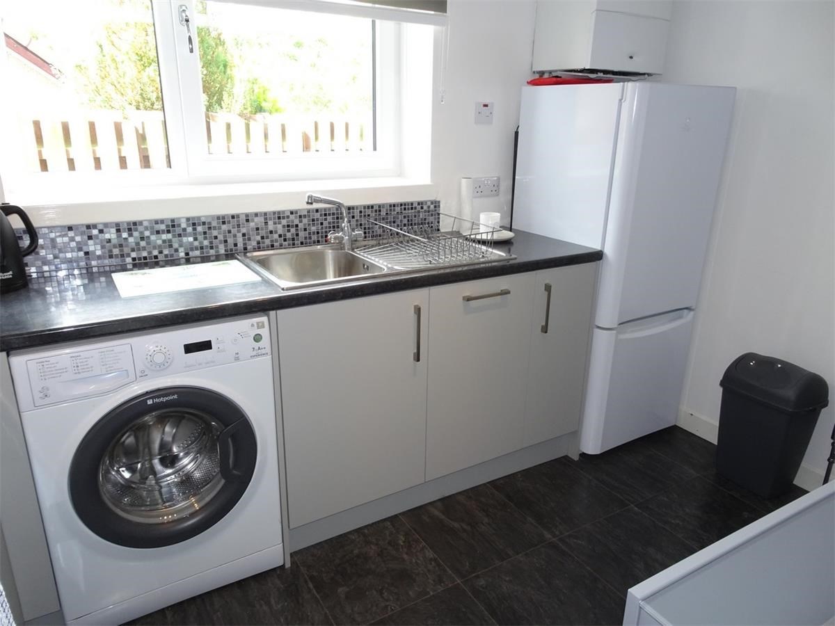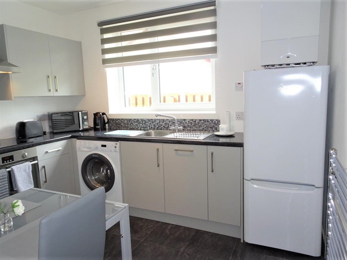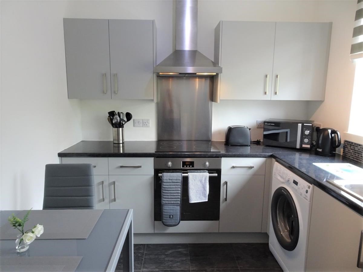 Nicely appointed kitchen fitted with a comprehensive range of light grey, modern base and wall units, complemented by the worktop. Small dining table and chairs. Fitted with electric oven and hob with extractor fan above, fridge freezer, microwave, slimline dishwasher and washing machine. Large window to the north fitted with new “day and night” blind. Vinyl tile effect flooring.