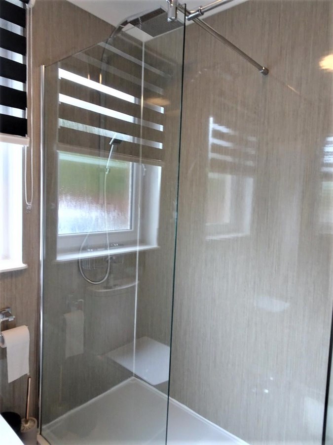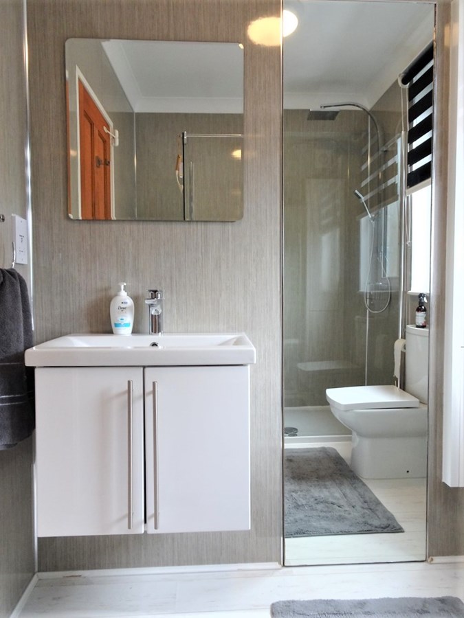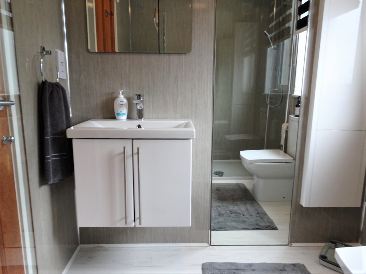 Contemporary shower room, with large walk in shower cubicle, and cleverly disguised deep storage cupboards fitted behind the floor to ceiling mirror and wall cupboard.