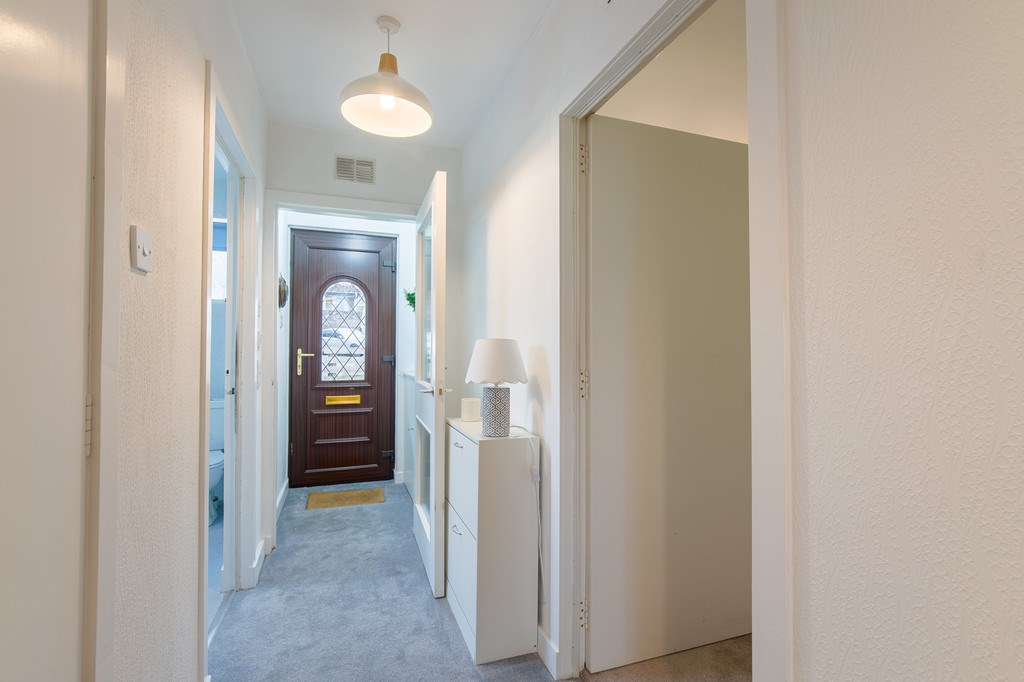 KITCHEN The kitchen for this property is located straight ahead as you enter through the front hallway. The kitchen itself has a bright, cheerful atmosphere that feels both practical and inviting. The kitchen contains an oven cooker, sink area, fridge freezer, washing machine and even a dining space. The light cabinetry and subtle patterned walls keep the look clean and airy, while adding a gentle touch of character.