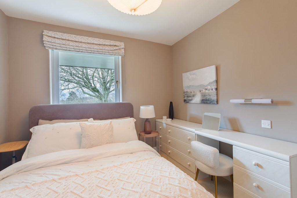 BEDROOM The bedroom for this property is located through the second door on the left as you enter through the front hallway. The warm neutral tones on the walls pair perfectly with the light bedding, giving the space a sense of openness while still being cozy and inviting. The bed looks especially comfortable, layered with plush pillows and textured throws that add a certain warmth. Overall, it's a tranquil and well-balanced room that feels like a perfect retreat for rest and relaxation.
