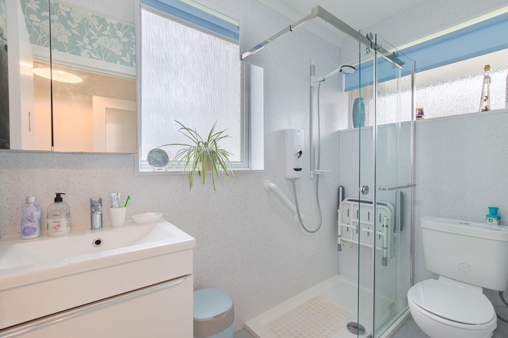 BATHROOM The bedroom for this property is located immediately on the right as you enter through the front hallway. The room here feels clean and well maintained with a plentiful amount of light being ushered in through an obscured glass window. The walk-in shower area is paired well with the stylish white and blue colour scheme, highlighting the modern interior and sleek finishes.