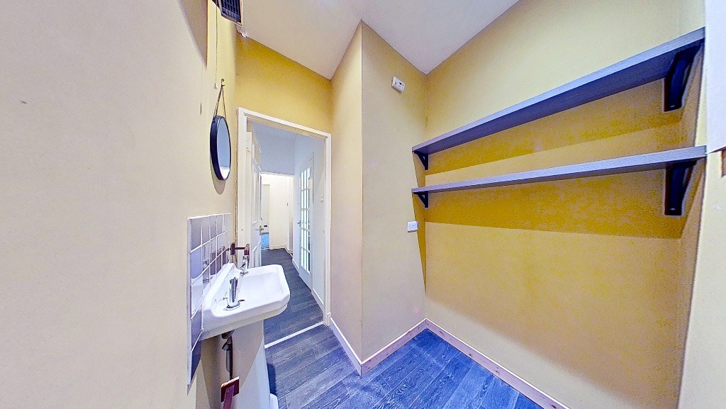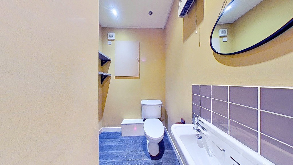 This ground floor property offers a welcoming entrance hallway leading to a bright and spacious living area, a well-proportioned kitchen, and a convenient W.C. on the entrance level. Downstairs, the property comprises a generous double bedroom with built-in storage and a modern bathroom with shower over bath.
