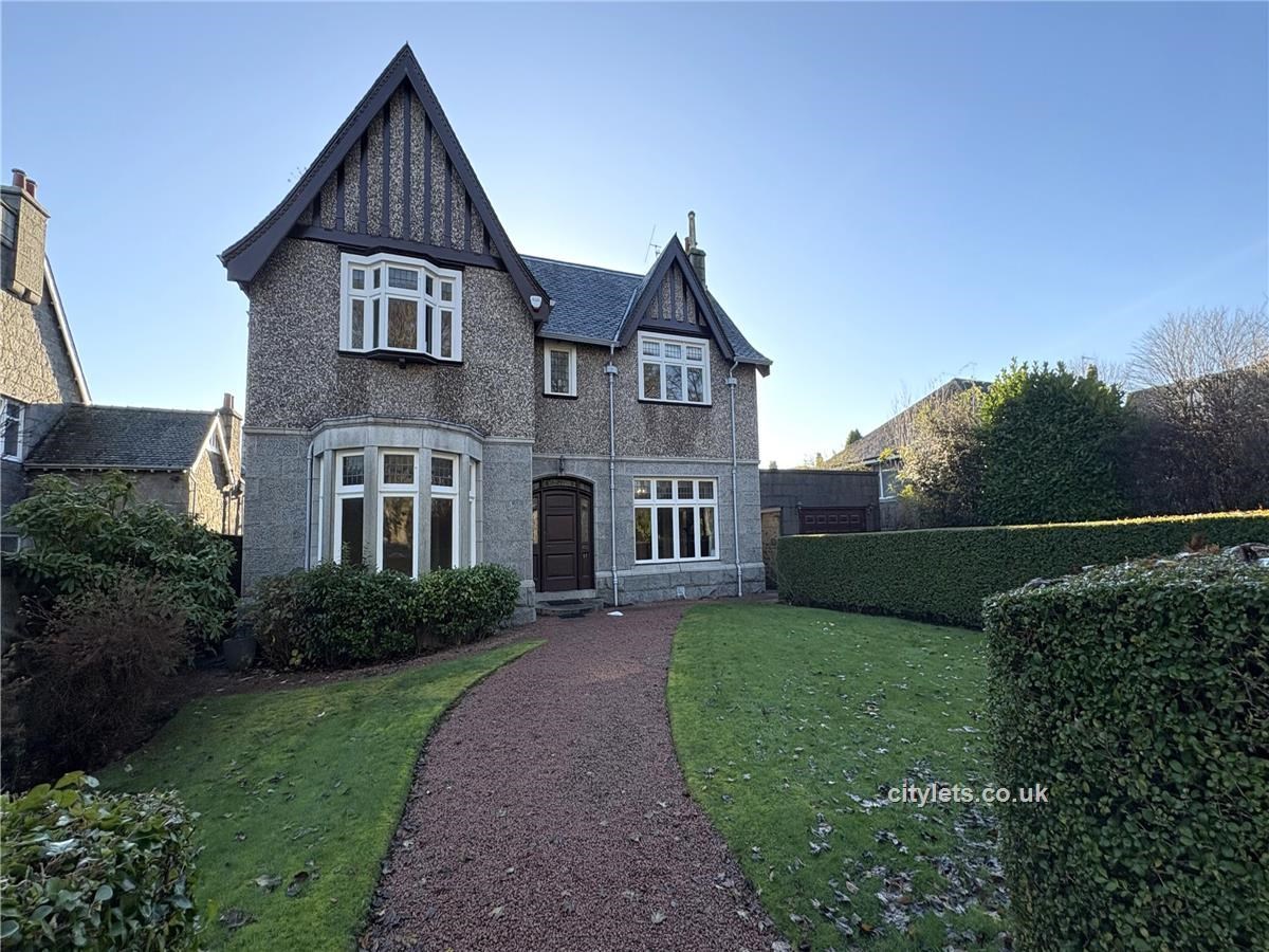 This unfurnished, five-bedroom detached house located at Rubislaw Den South, comprises on the ground floor; an entrance hallway with stained glass panels and original decorative flooring, two reception rooms with fireplaces, a dining room with serving hatch from the kitchen, a kitchen fitted with storage units, integrated fridge and dishwasher, and a utility room with sink, washing machine, tumbler dryer and fridge freezer. There is also a downstairs WC, a separate shower room, and a smaller room traditionally referred to as a maid’s room.
