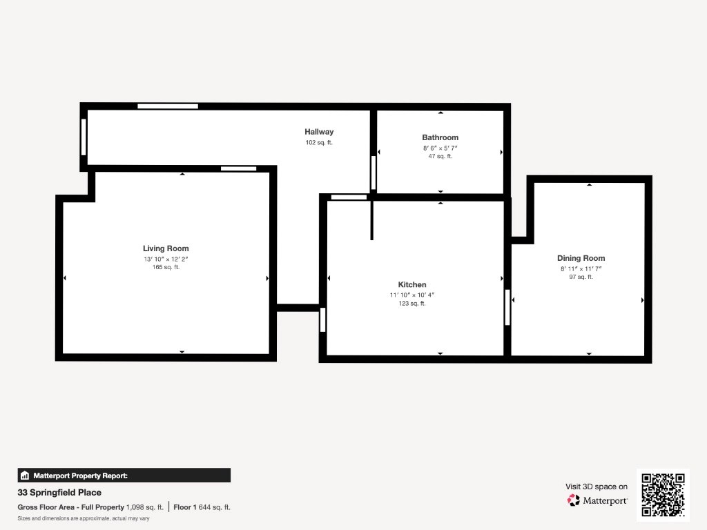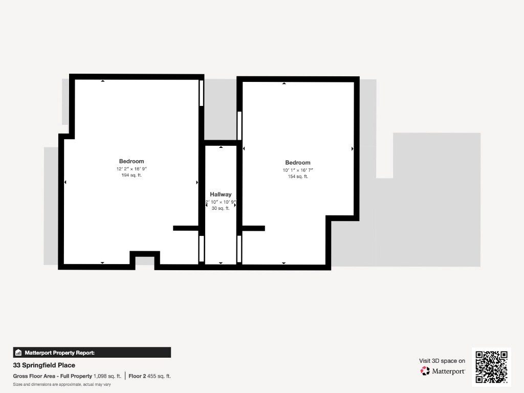 This two-story property at 33 Springfield Place, Aberdeen, unfurnished, offers 915 sq. ft. of living space, including two large bedrooms, bathroom large living room and kitchen + sunroom. The ground floor spans 538 sq. ft., while the upper floor measures 377 sq. ft. The primary bedroom is notably spacious at 194 sq. ft..