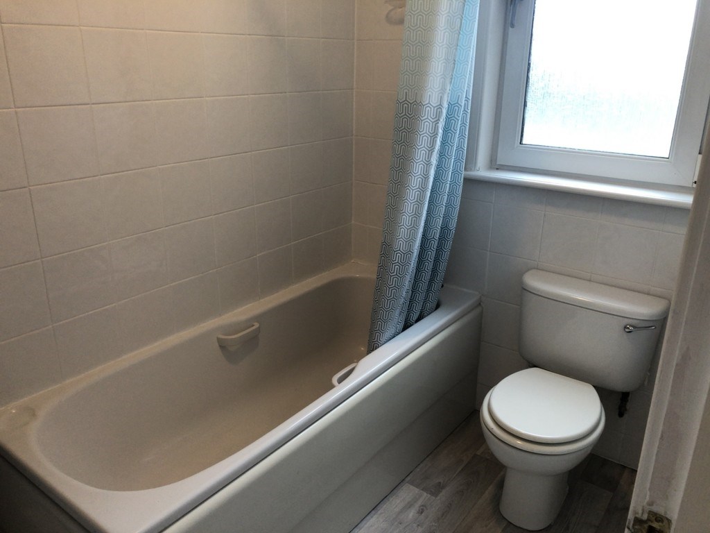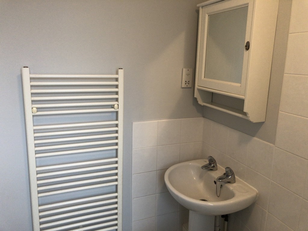 BATHROOM Bright, fresh three piece suite with shower above bath and towel radiator.