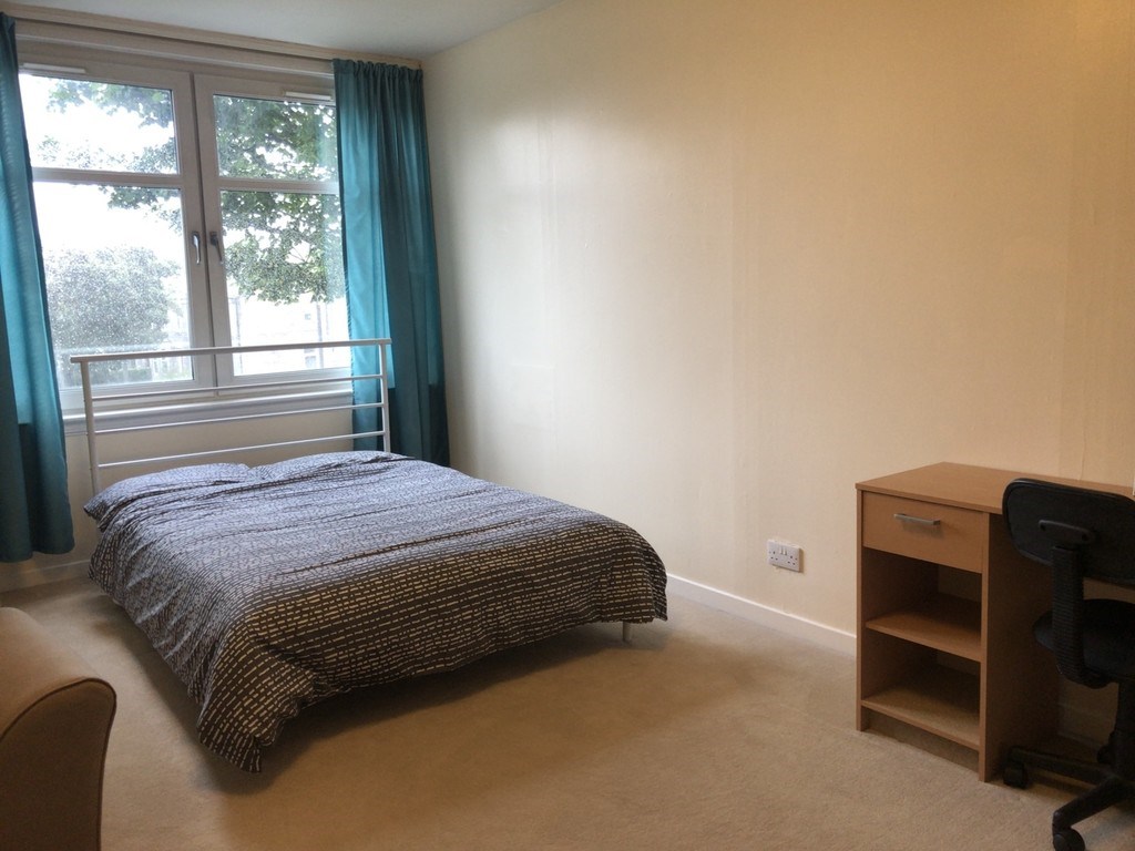BEDROOM 1 Double bedroom with plenty of storage, large bright windows with desk and chair.