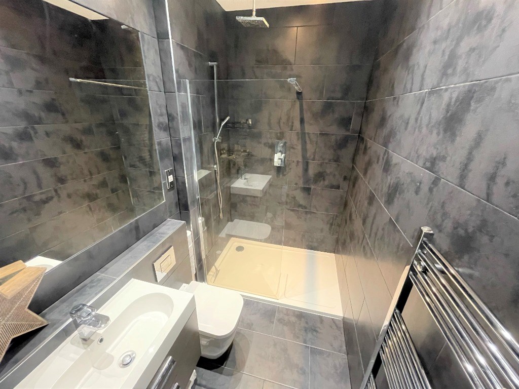 Modern shower room with white suite, and large shower enclosure with rain shower head.
