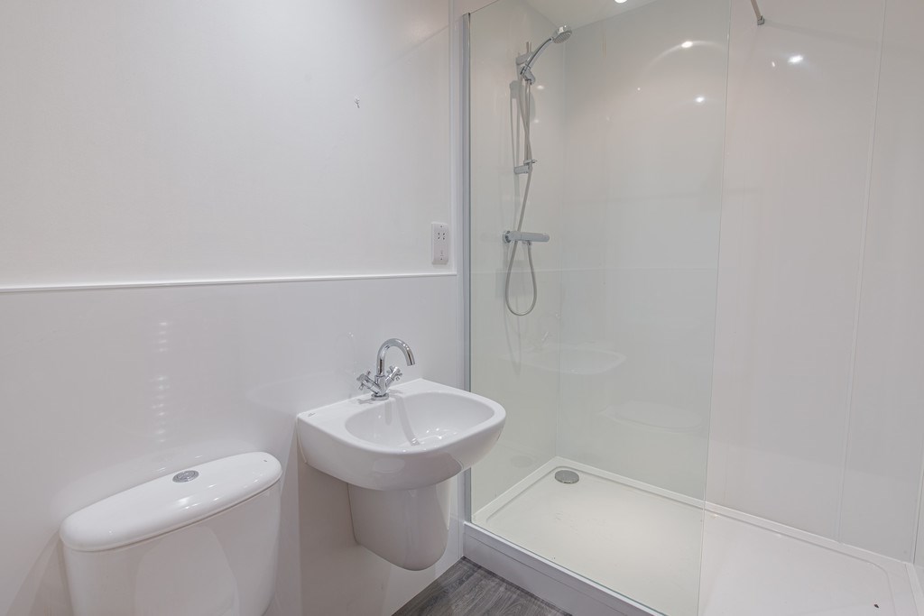 BATHROOM Recently refurbished, the modern shower room is finished in sleek white panelling for a clean, minimalist look. It includes a walk-in shower with a glass screen, a floating sink with chrome mixer tap, and a close-coupled toilet. Grey vinyl flooring adds a practical and contemporary finish.