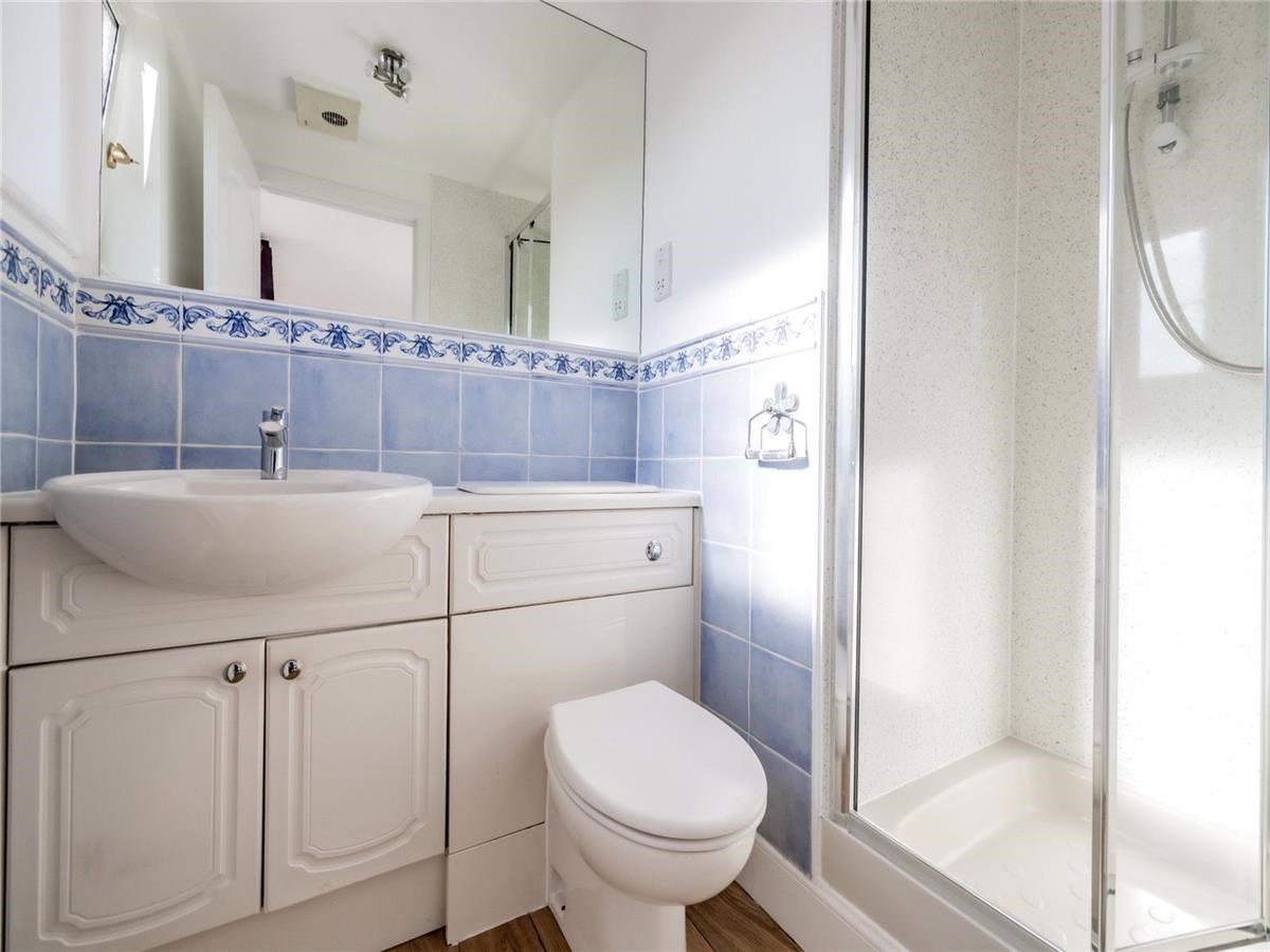 Modern en-suite shower room, fully fitted with a white two piece suite comprising wash hand basin set into vanity unit, w.c. and separate shower unit.