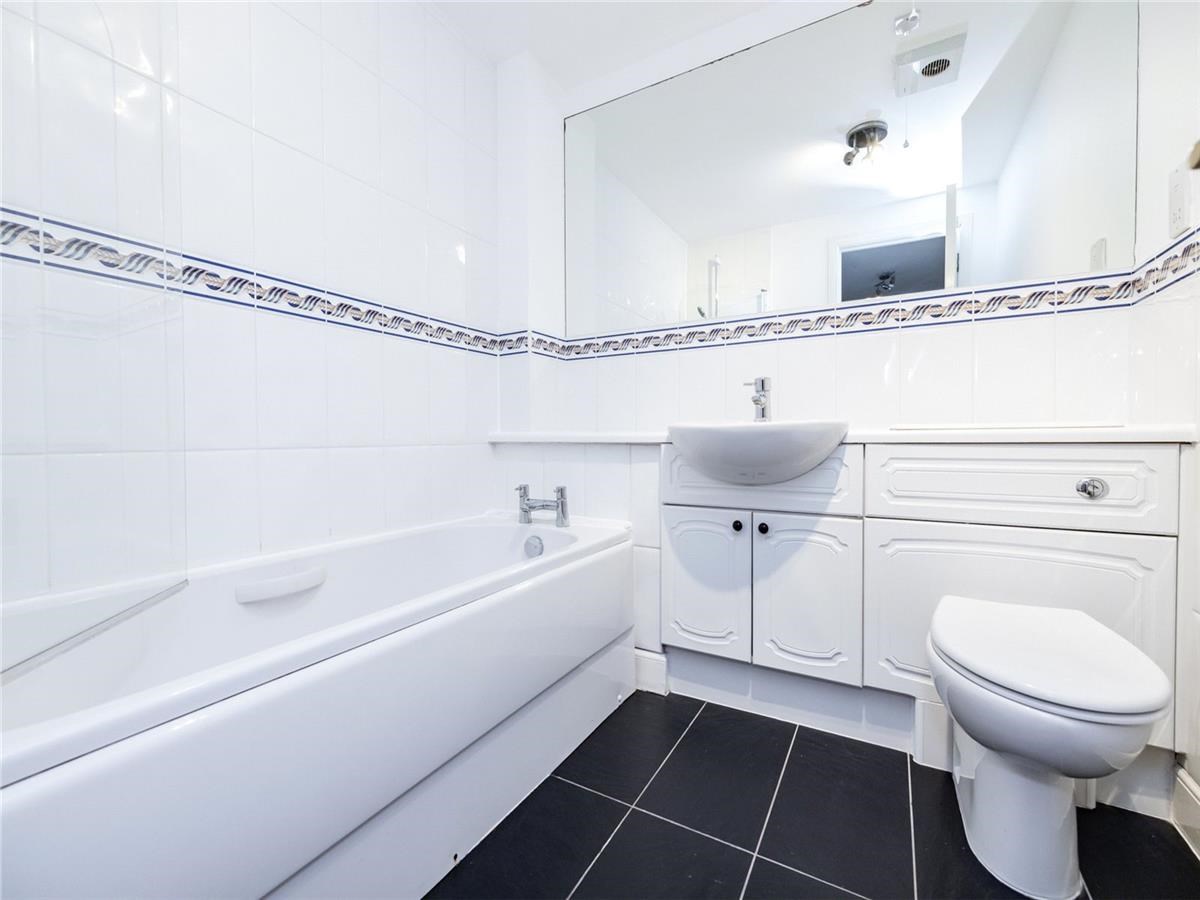 Stylish bathroom fitted with a white three piece suite comprising of w.c., wash hand basin set into a vanity unit and bath with overhead electric shower.