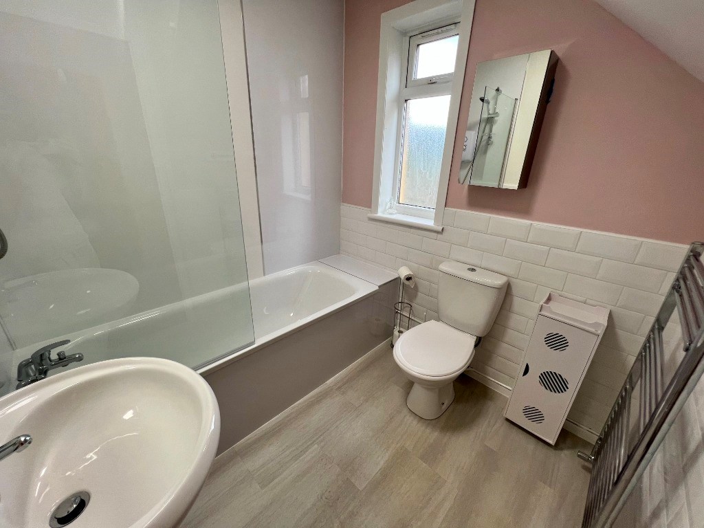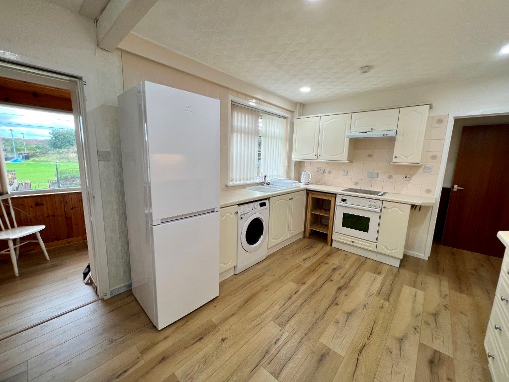 Fully renovated, there are three double bedrooms, one with an en suite shower room and the master bedroom has built in wardrobes. Wooden flooring throughout the ground floor combined with large windows, make this a lovely bright home. The kitchen has lots of storage space and a new fridge and washing machine are provided. There is also ample space in the kitchen for a table and chairs. The modern main bathroom is downstairs, with the en-suite upstairs.