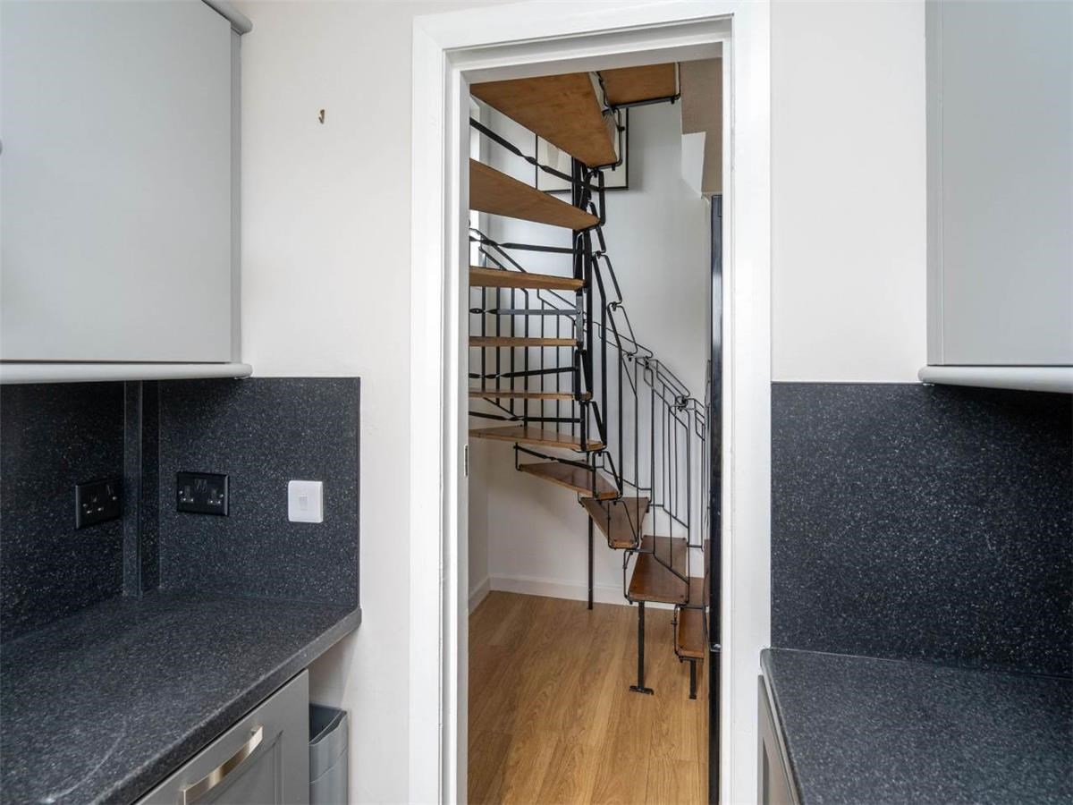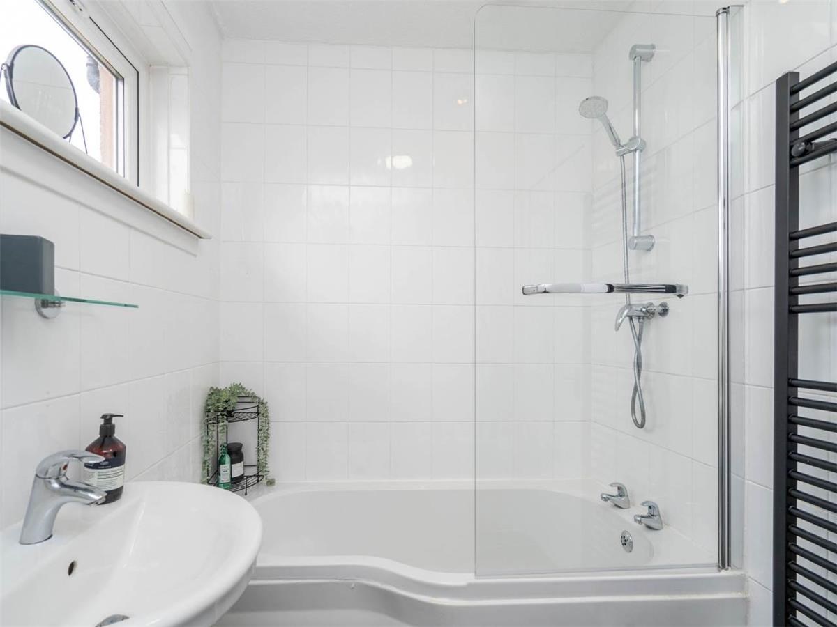 Upstairs, sits the spacious bedroom with large built-in wardrobes, the super king bed has 4 storage drawers. A bright bathroom with shower over bath tub.