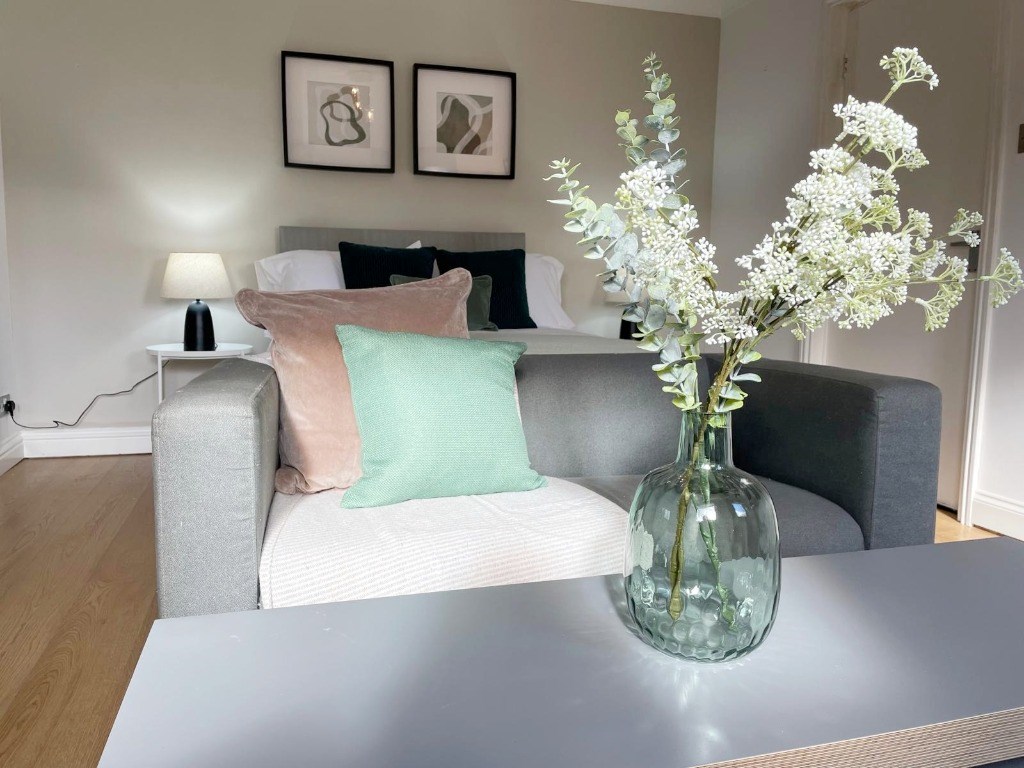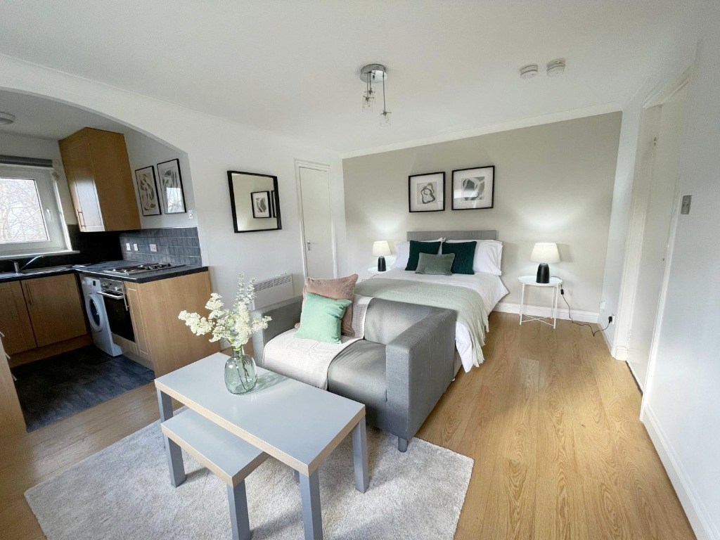 First floor, fully furnished studio flat now available. This lovely and cosy flat is a perfect starter home for someone looking to have their own space. This studio flat has a cosy Livingroom/ Bedroom space combined kitchen equipped with an oven, undercounter fridge freezer and washing machine. There is a bathroom with a bath and an electric shower and in the hallway there is a cupboard that offer extra storage.