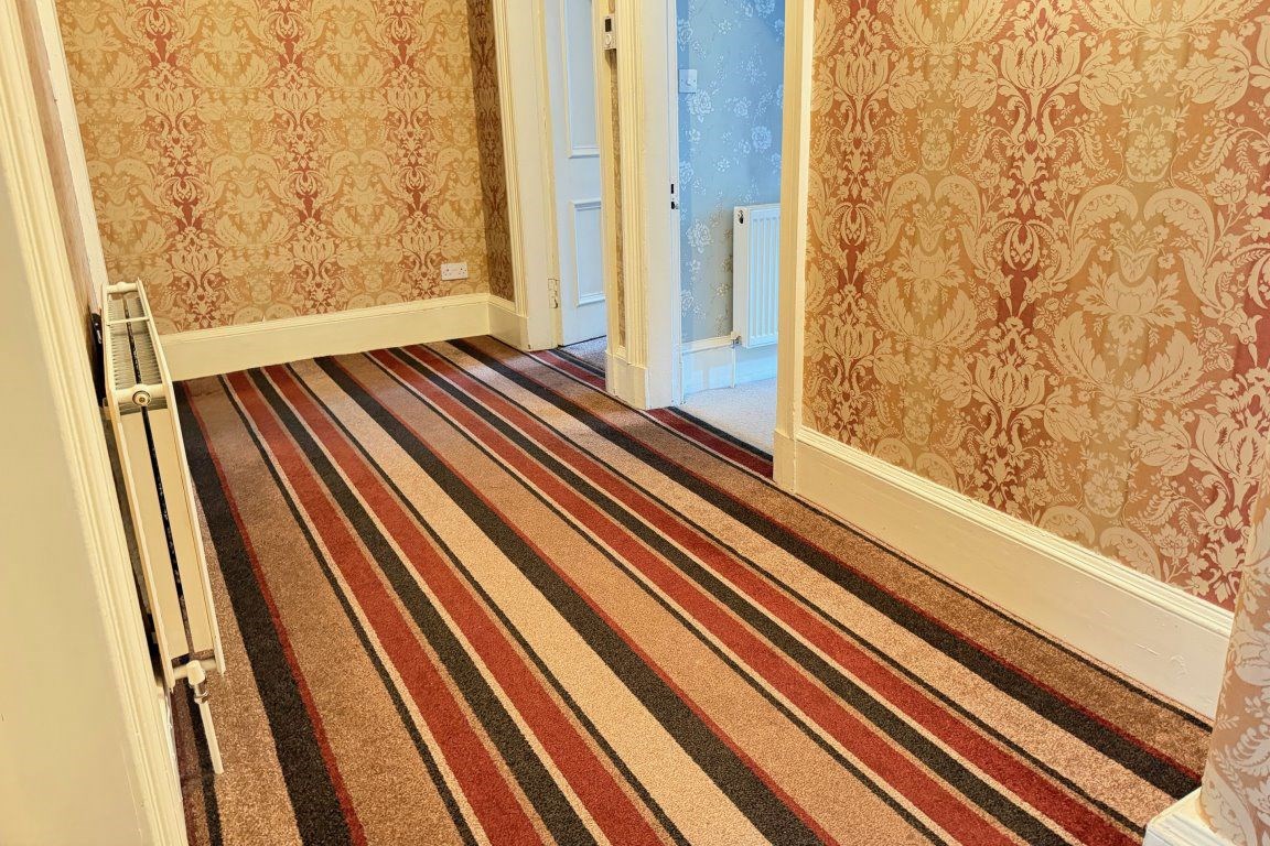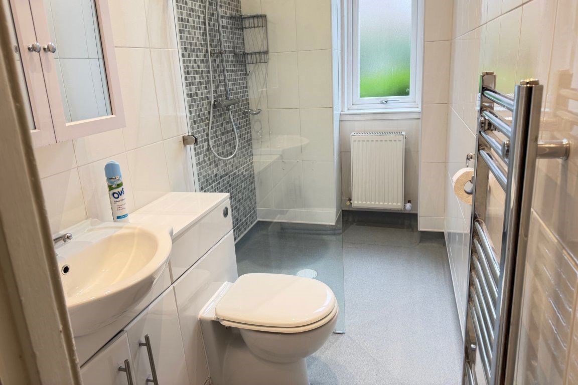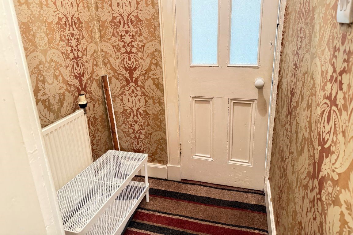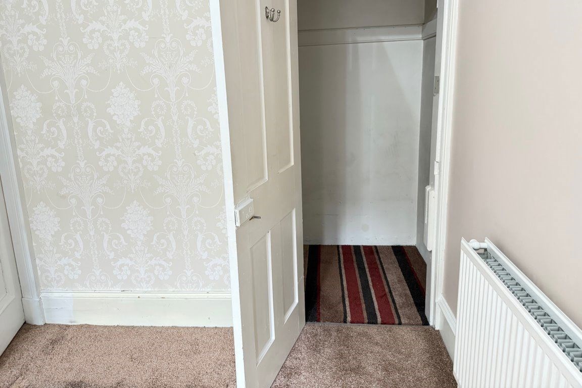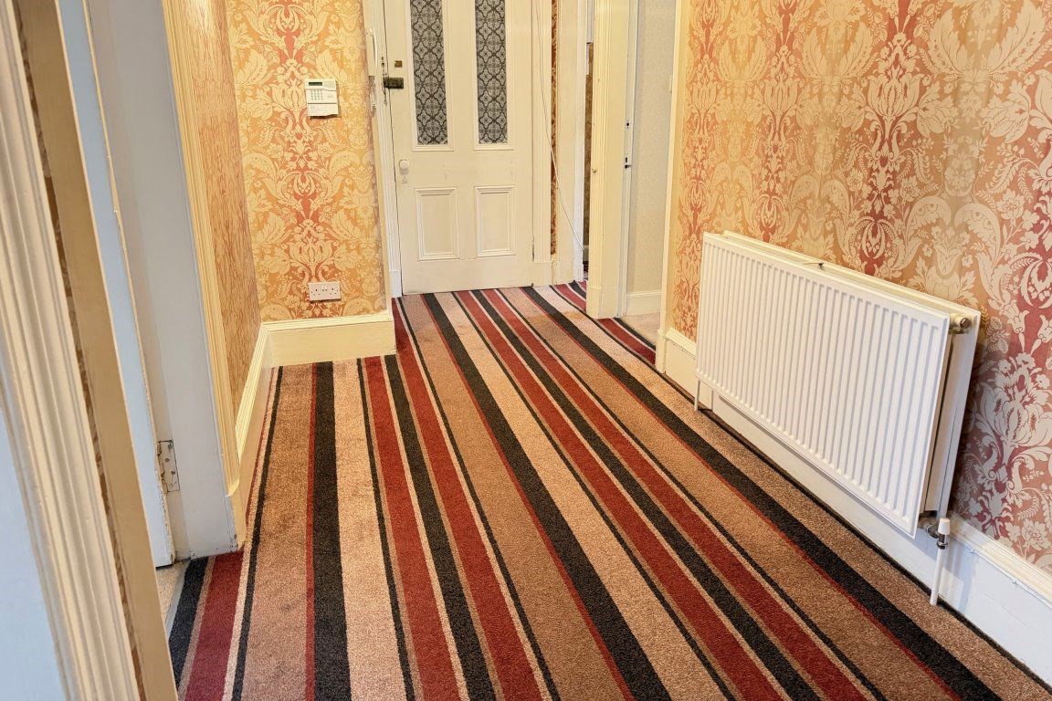 Security controlled access onto entrance, near 18' broad reception hall with deep recessed storage cupboard, impressive spacious period style bay window lounge enjoying tree lined aspects, ornate decorative cornicing, feature fireplace with electric fire, master bedroom again enjoying tree lined aspects to front with deep walk-in storage cupboard, additional double bedroom to the rear, fabulous modern fitted dining kitchen with integrated oven, hob and hood and refitted wetroom comprising two piece white suite and walk-in shower.