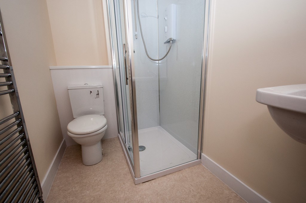 SHOWER ROOM Modern three piece white suite with double shower cabin.