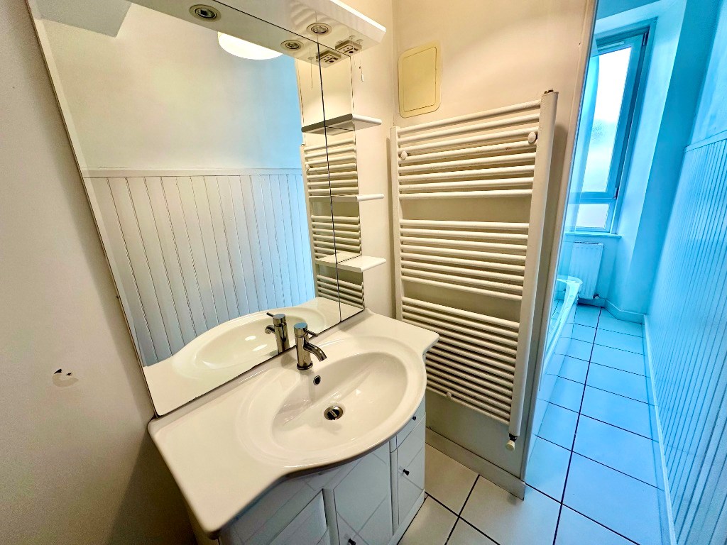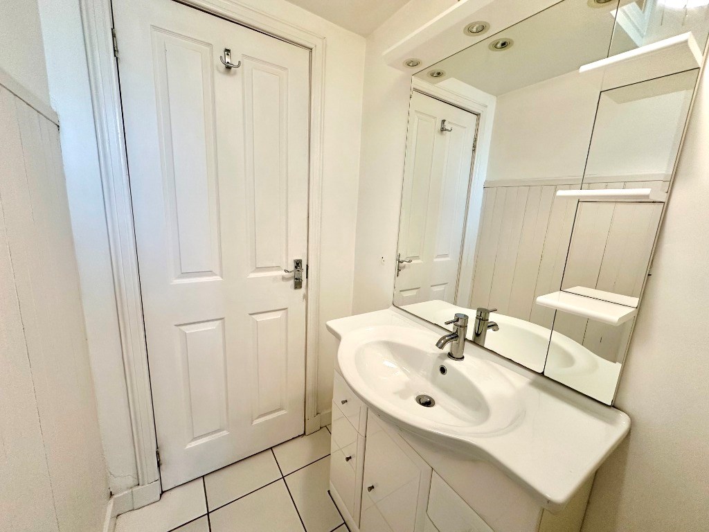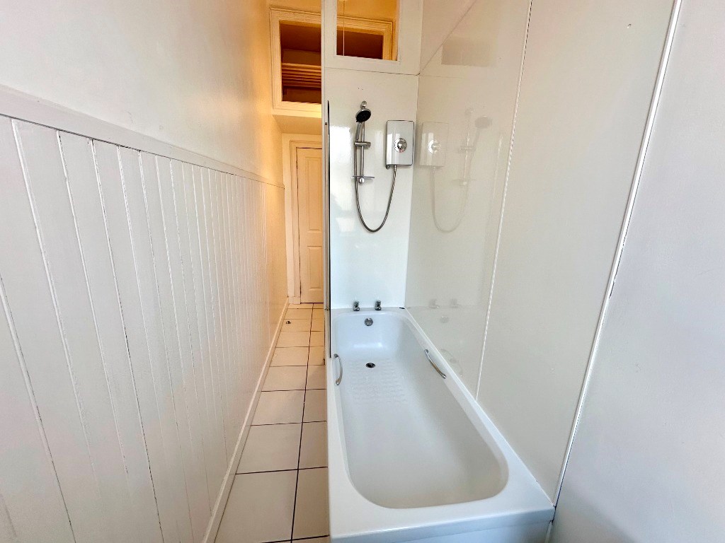 The bedroom is a double in size with double glazing and ample space for furniture with a good sized storage cupboard. The bathroom comprises of a wash basin on entry with storage underneath, a heated towel rail, wc, bath with electric shower overhead as well as a large window for ventilation.